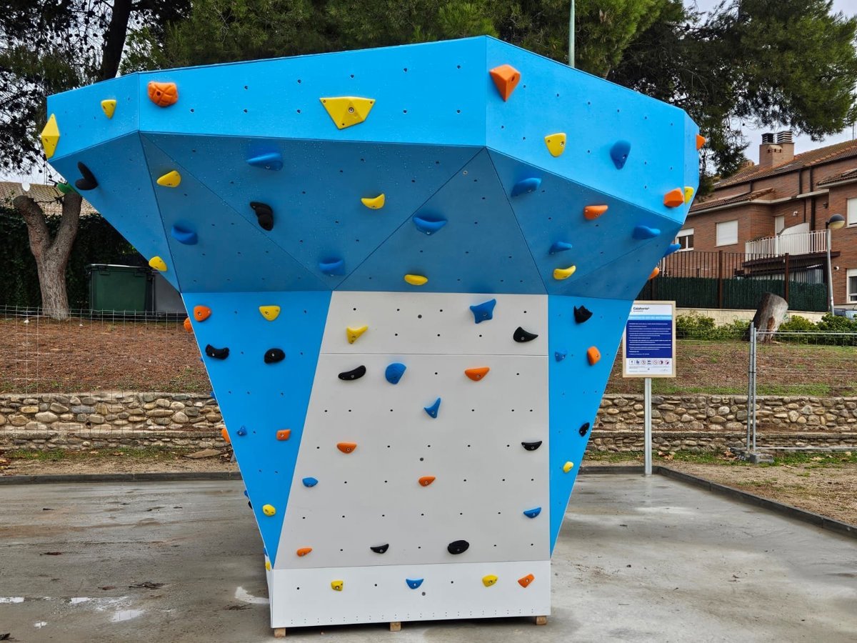 Solo falta poner el pavimiento de caucho, que se realizará durante estos días. El bloque de escalada es azul y blanco, realizado en madera de abedul y está equipado con 150 presas de diferentes tamaños y colores.