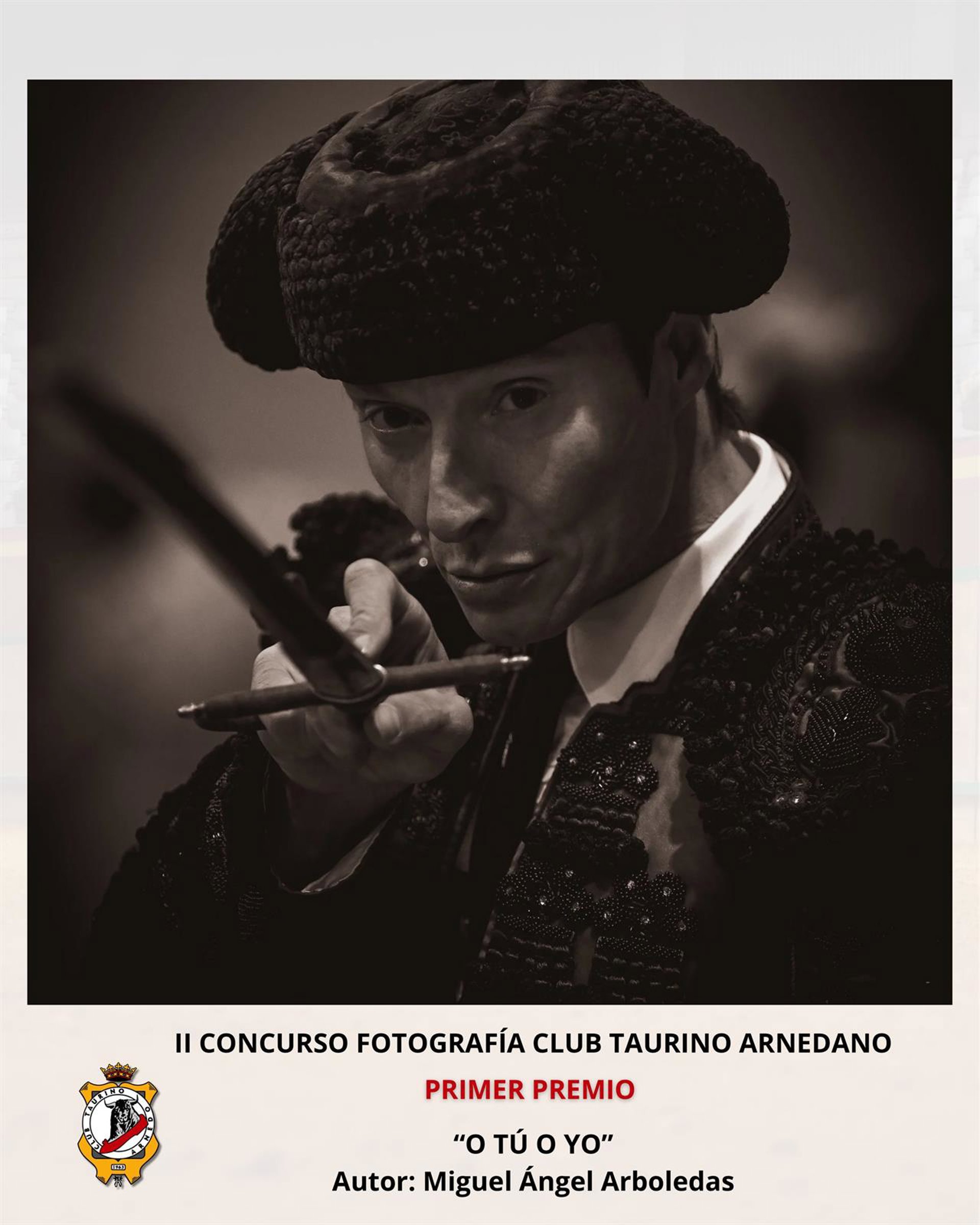 El primer premio, dotado con 300 euros, ha sido otorgado a Miguel Ángel Arboledas por la obra 'O tú o yo', cuya explicación es la siguiente: "La hora de la verdad reflejada en el rostro de Diego Urdiales. El rictus del momento clave. La espada afilada. La mirada mezcla de pasión, entrega, miedo y seguridad. El momento excelso del rito del toreo que es la muerte. O tú o yo. El punto final a una obra. La rúbrica".