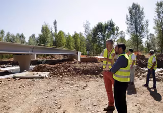 El director general de Calidad Ambiental y Agua, José María Infante, ha visitado hoy los trabajos de construcción de la futura pasarela peatonal sobre el río Iregua en Villamediana, coincidiendo con el izado de las vigas de la estructura que facilitará la accesibilidad para peatones y ciclistas con unas mejores condiciones de seguridad.