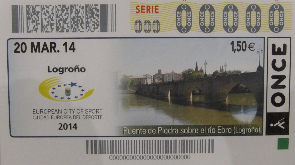 La Organización Nacional de Ciegos de España ONCE dedicará su cupón del próximo jueves, día 20 de marzo, a Logroño, Ciudad Europea del Deporte, contando para ello con una imagen del Puente de Piedra de la capital riojana. Se editarán cinco millones y medio de cupones con este lema.