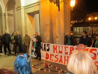 A pesar de que la concentración estaba prevista frente a la Delegación, la intermitente lluvia y el viento ha hecho que el acto se realice bajo los soportales de la calle Muro de la Mata. Tras una pancarta en la que se podía leer 'No más muertes por desahucios' y bajo los gritos de 'Sí se puede', los integrantes de la Plataforma han leído un comunicado secundado con aplausos y gritos de las varias decenas de personas que han acudido a la llamada de la Plataforma.