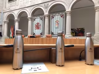 señorías se verá sustituida por la presencia de recipientes reutilizables de acero inoxidable, con la imagen institucional, que con capacidad para 75 centilitros se pondrán a disposición de sus señorías en cada sesión, así como también al personal funcionario y