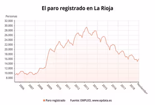 En el caso de La Rioja, la tasa de paro se sitúa en el 10,32 por ciento, tres décimas por encima que el mes anterior. En cuanto a la tasa interanual, hay 1.187 desempleados menos inscritos en el INEM que en noviembre del año pasado, lo que supone un descenso del 6,90 por ciento con respecto a hace un ejercicio.