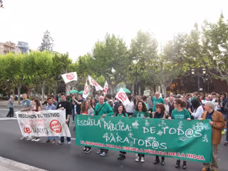 La Plataforma por la Escuela Pública de La Rioja se ha concentrado esta tarde, frente al Palacio de Gobierno riojano en Logroño, para exigir, entre otras cuestiones, mayor financiación para la educación pública, la reversión de los recortes en la enseñanza, así como la bajada de las ratios en la aulas y sacar la religión de la escuela.