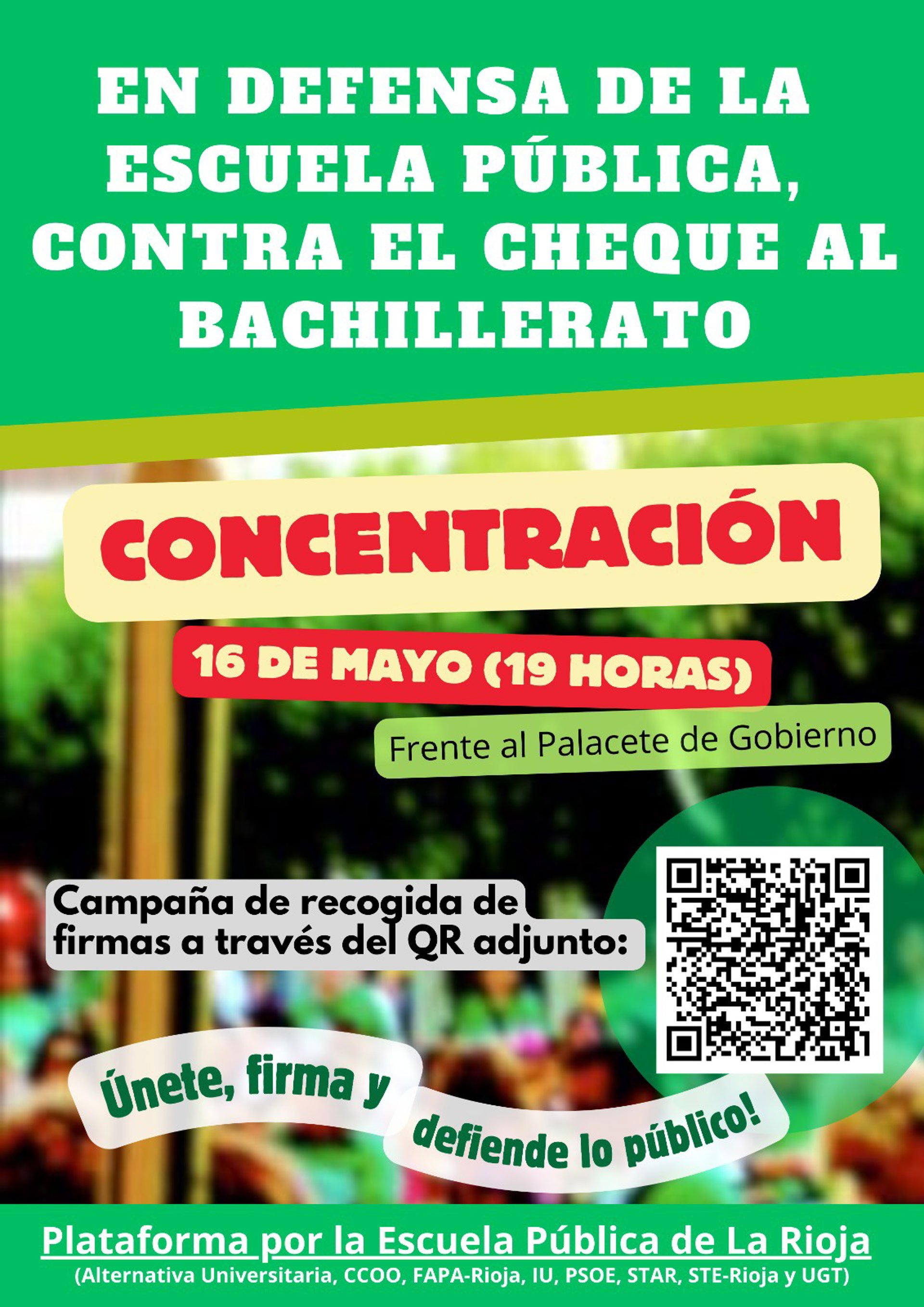 La Plataforma por la Escuela Pública ha iniciado una recogida de firmas y ha convocado una concentración contra la decisión del Gobierno riojano de recuperar el cheque bachillerato que supone, han dicho, financiar a empresas en detrimento de la inversión en centros públicos.