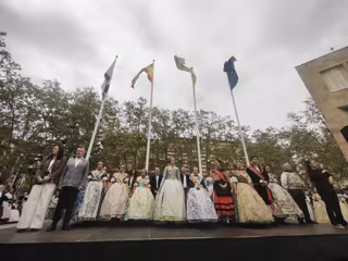 Un acto emotivo, tras el que todos han bajado a la Plaza del Ayuntamiento, donde una multitud de personas esperaba el desfile de falleros y falleras y de autoridades, que se ha instalado en un escenario junto a las banderas.