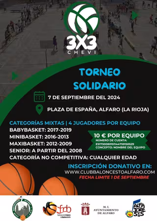 Este torneo solidario regresa con novedades, la principal, su cambio de denominación: pasa a llamarse 3x3 Chevi en homenaje del Club Baloncesto Alfaro a José Vicente Martínez, entrenador histórico y gran divulgador en Alfaro del deporte de la canasta, un educador por cuyas enseñanzas han pasado muchas generaciones que hoy siguen jugando o entrenando.