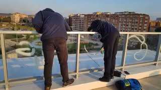 Los agentes fotografiaron a los dos individuos cuando pensaban que podían haber localizado a los autores de los daños pero para su sorpresa lo que encontraron fue a dos jóvenes que limpiaban con gel hidroalcohólico las mamparas de cristal de la barandilla de los grafitis hechos previamente.