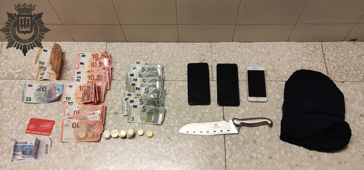 En el registro posterior, los agentes se incautaron del arma utilizada en el delito, 817 euros y el móvil del responsable del locutorio, así como diversos objetos que también fueron sustraídos y que habían ido arrojando durante la huida.