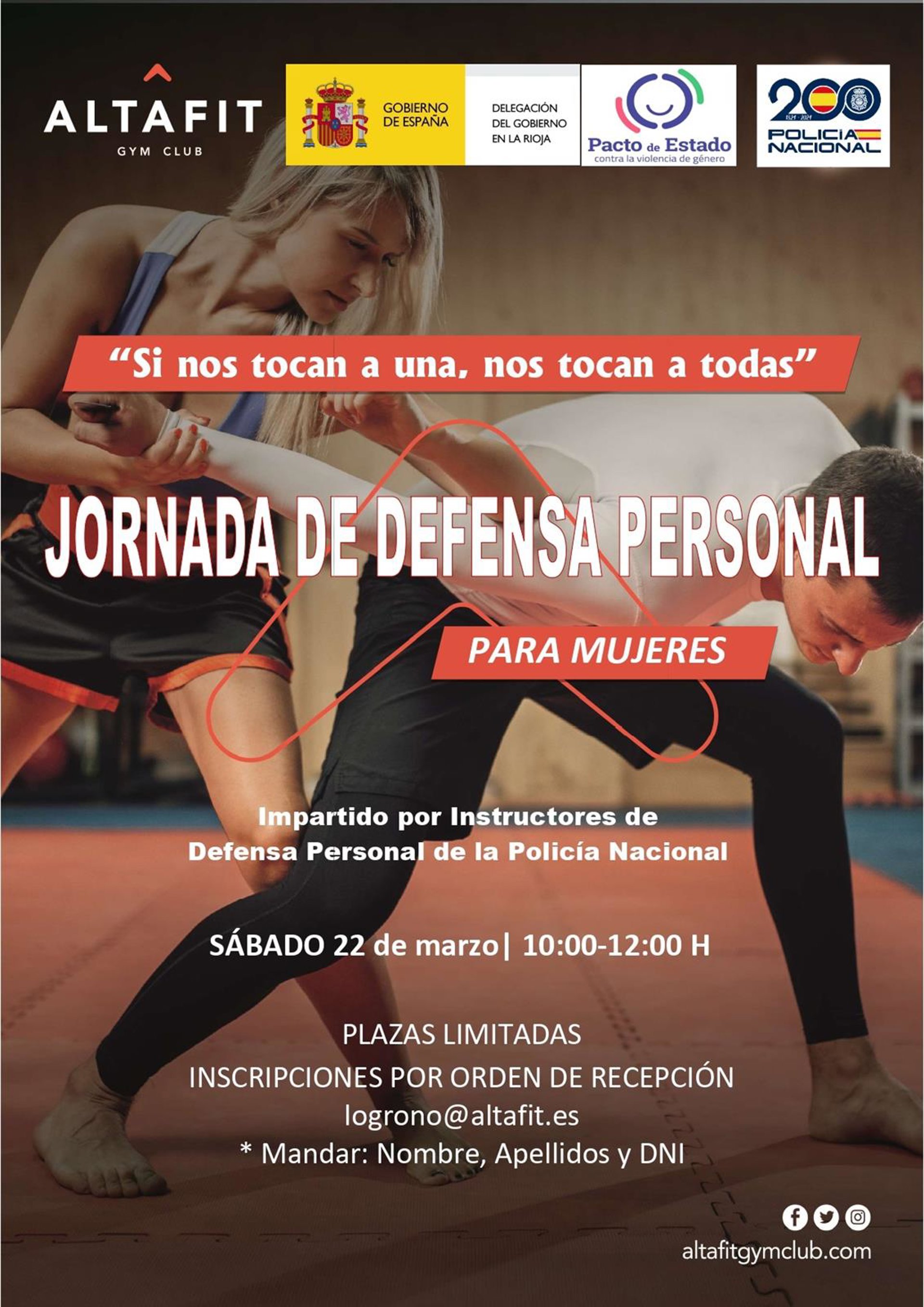Agentes de la Policía Nacional, instructores especializados en Defensa Personal adscritos a esta Jefatura Superior de Policía de La Rioja, en coordinación con la Delegación del Gobierno de La Rioja y en colaboración con el Gimnasio Altafit Gym Club han abierto el plazo para inscribirse hasta el 21 de marzo, en una Jornada de Defensa Personal Femenina en las instalaciones de este Gimnasio para cuarenta y cinco mujeres y que tendrá una duración de dos horas.