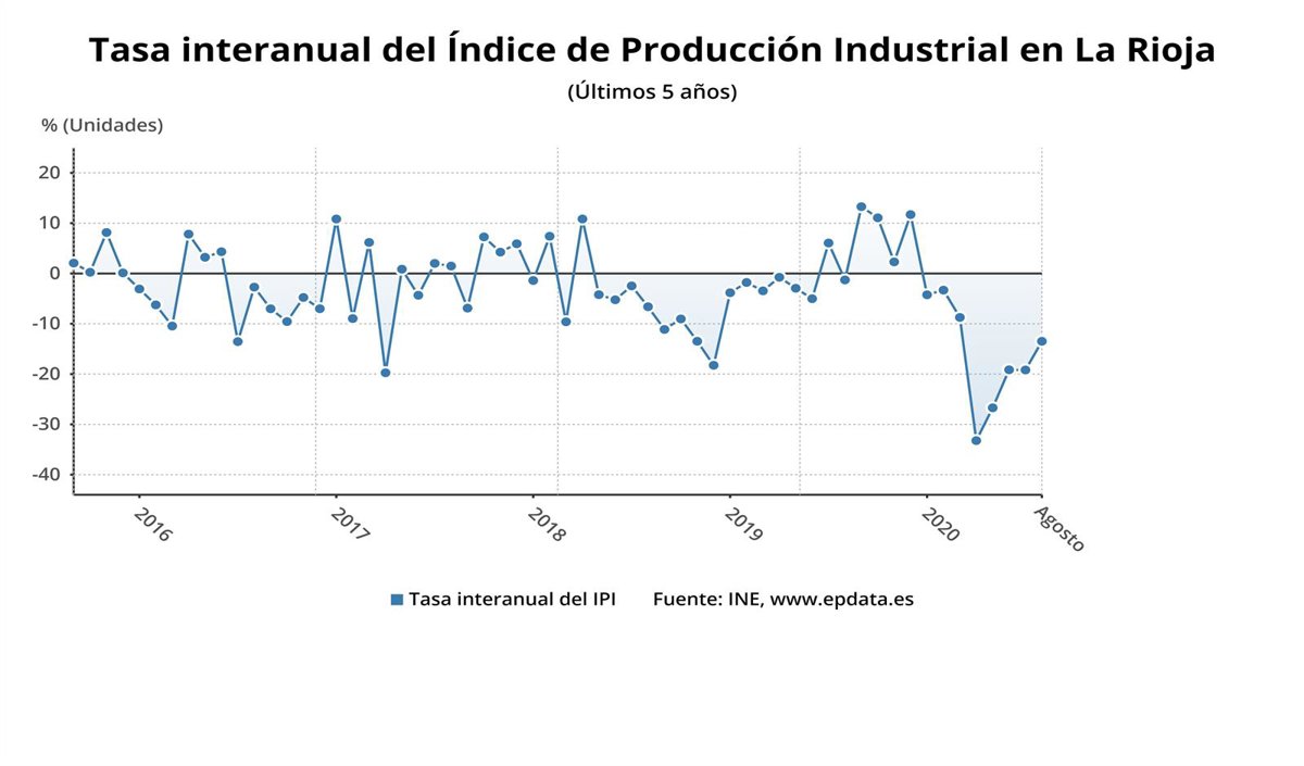 El Índice General de Producción Industrial (IPI) bajó un 13,5 por ciento en agosto en La Rioja en relación al mismo mes de 2019, la cuarta que más ha descendido.