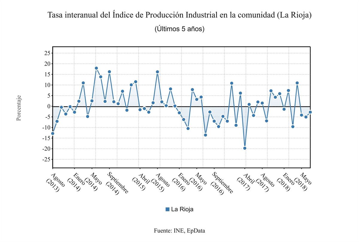 El índice de producción industrial ha caído un 2,8 por ciento en julio respecto al mismo mes del año anterior, según los resultados del Índice de Producción Industrial (IPI) de La Rioja difundidos este viernes por el Instituto Nacional de Estadística (INE).