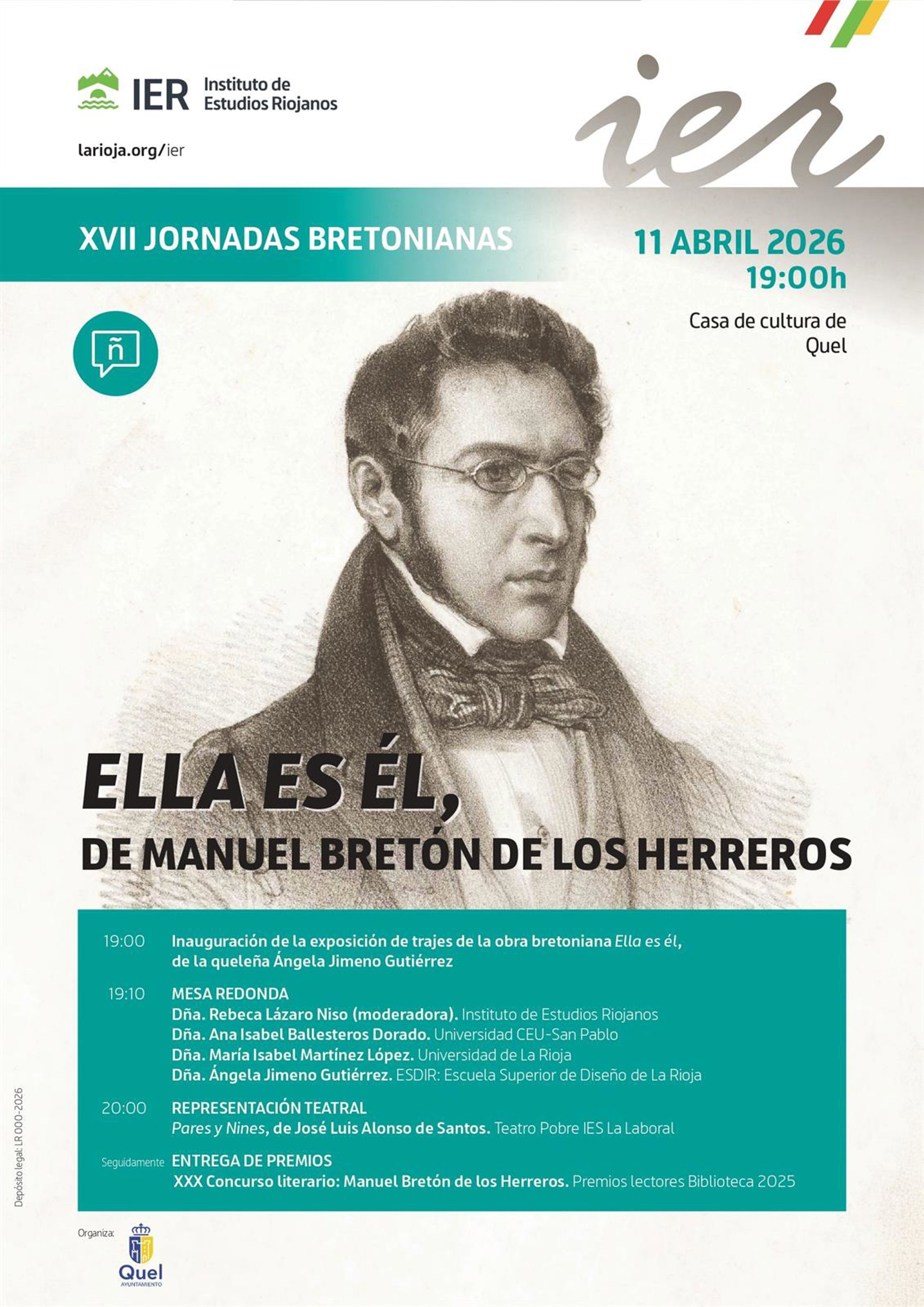 El Instituto de Estudios Riojanos, en colaboración con el Ayuntamiento de Quel, celebrará el próximo sábado, 11 de abril, las XVII Jornadas Bretonianas, una iniciativa cultural consolidada que tiene como objetivo difundir la vida y la obra del dramaturgo riojano Manuel Bretón de los Herreros, natural de la localidad de Quel y una de las figuras más destacadas del teatro español del siglo XIX.
