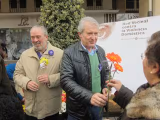 La Red Vecinal de Apoyo a las Víctimas de Malos Tratos conmemora el Día Internacional de Lucha contra la Violencia de Género con el reparto de gerberas, flor representativa de la Red Vecinal, en la plaza del Mercado de Logroño. A la iniciativa se han querido sumar los consejeros de Presidencia y Justicia y Salud y Servicios Sociales, Emilio del Río y José Ignacio Nieto, respectivamente.
