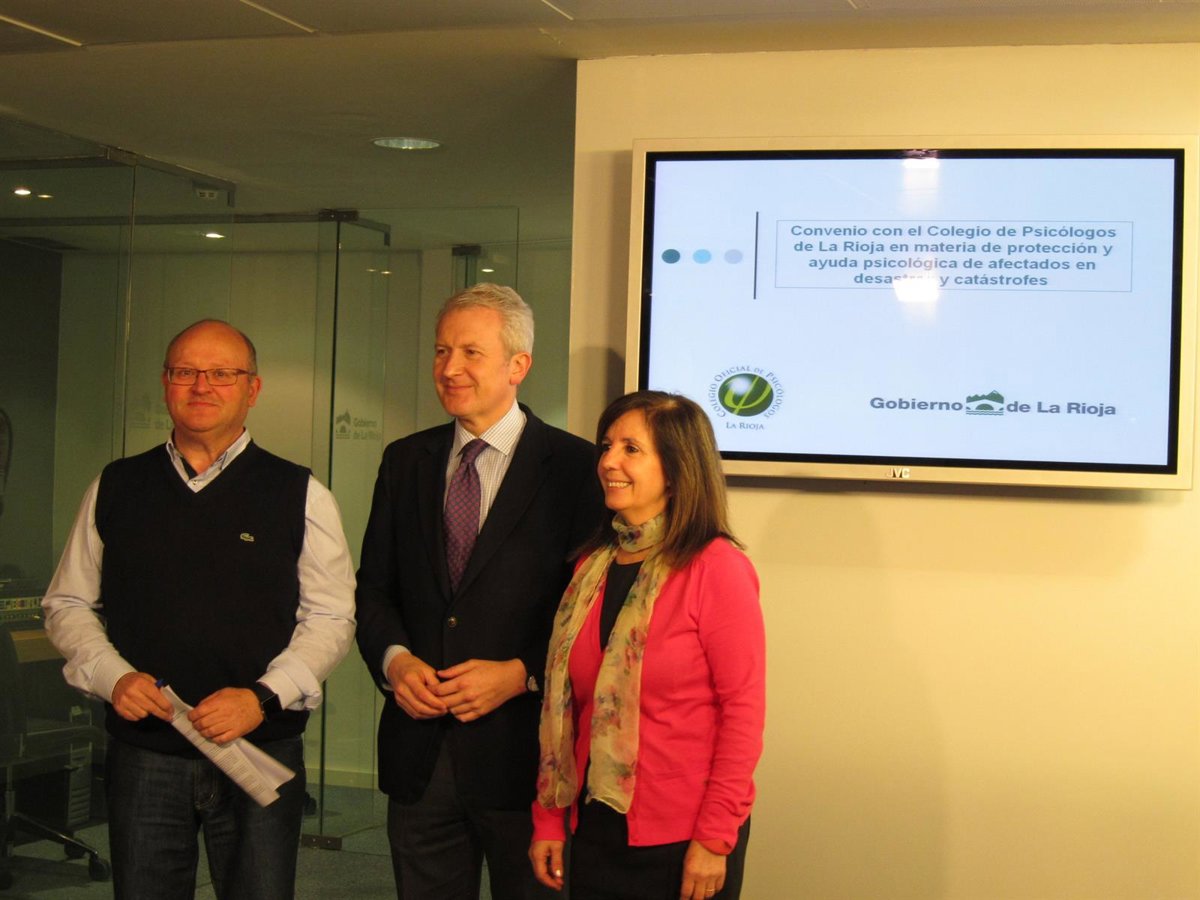 El consejero de Presidencia y Justicia, Emilio del Río, y la decana del Colegio de Psicólogos de La Rioja, Pilar Calvo, han renovado hoy por quinto año la colaboración entre ambos organismos para mantener y reforzar el servicio de protección y ayuda psicológica a víctimas, familiares, intervinientes y otros afectados en el supuesto de desastres y catástrofes y por el que el Ejecutivo regional aporta la cantidad de 2.869 euros.