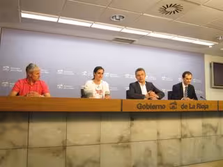 El consejero de Políticas Sociales, Familia, Igualdad y Justicia, Conrado Escobar, acompañado por José Antonio Rodríguez, miembro de la Junta Directiva de la Asociación Provincial de Autoescuelas de La Rioja; Víctor Rozas, director en La Rioja de Caja Rural de Navarra; y Paz Salazar, presidenta del Consejo de la Juventud de Logroño, ha informado esta mañana del programa de ayudas para obtener los permisos de conducir dirigida a jóvenes riojanos de entre 17 y 30 años.