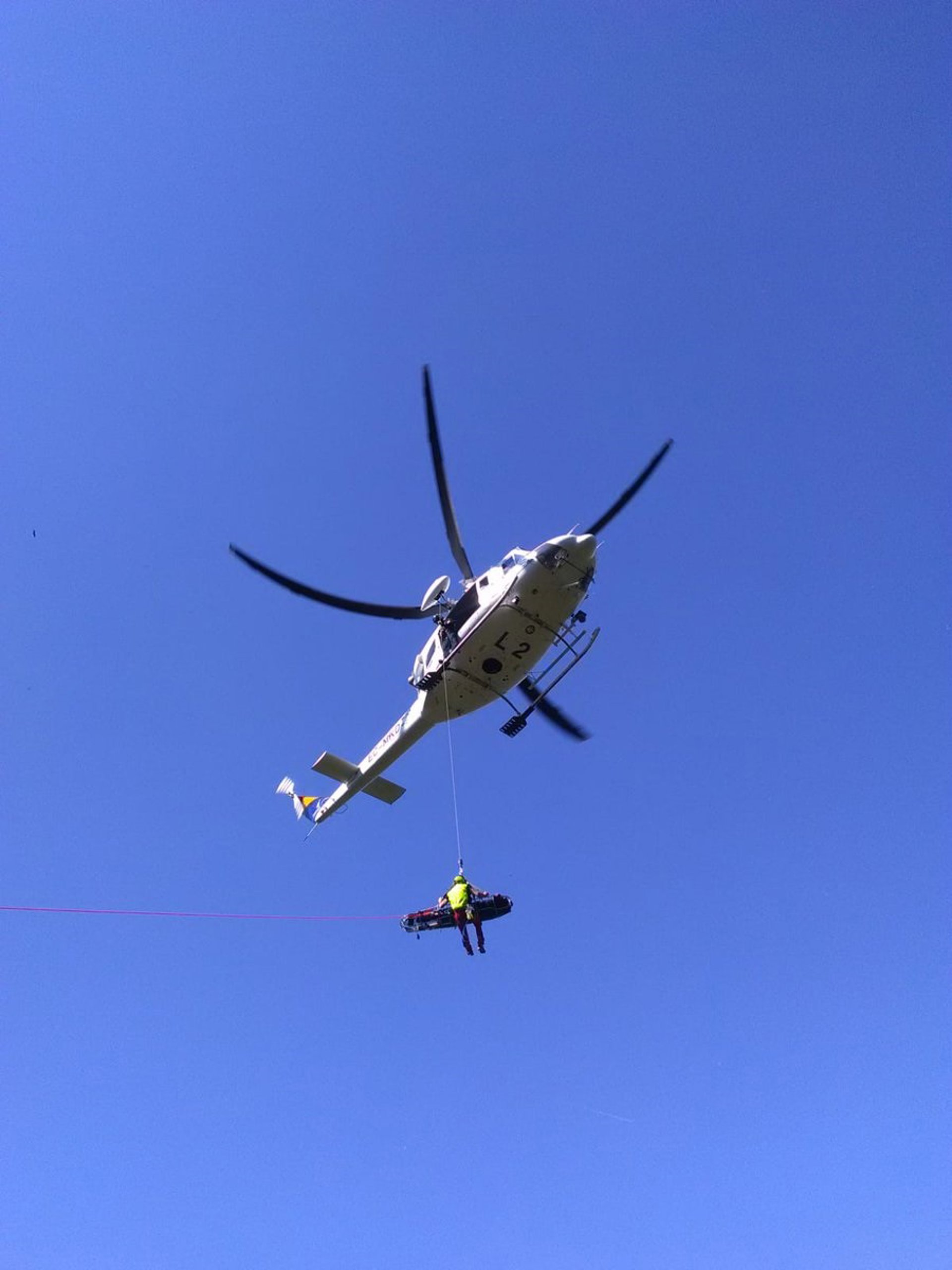 Una vez asegurado convenientemente por los rescatadores y realizadas las primeras tareas de auxilio, el helicóptero de medio natural del Gobierno de La Rioja le extrae de la zona por medio de una grúa para luego embarcar al resto del equipo.