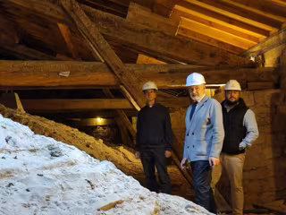 El alcalde de Logroño, Conrado Escobar, y el concejal de Urbanismo y Patrimonio, Íñigo López Araquistáin, han visitado este martes las obras para restaurar la estructura y la escalera que da acceso al campanario de la torre de la iglesia de Santiago el Real, que forman parte de la 'Red de miradores' en la que trabaja el Ayuntamiento para ofrecer una "experiencia más de ciudad y proteger nuestro patrimonio histórico".