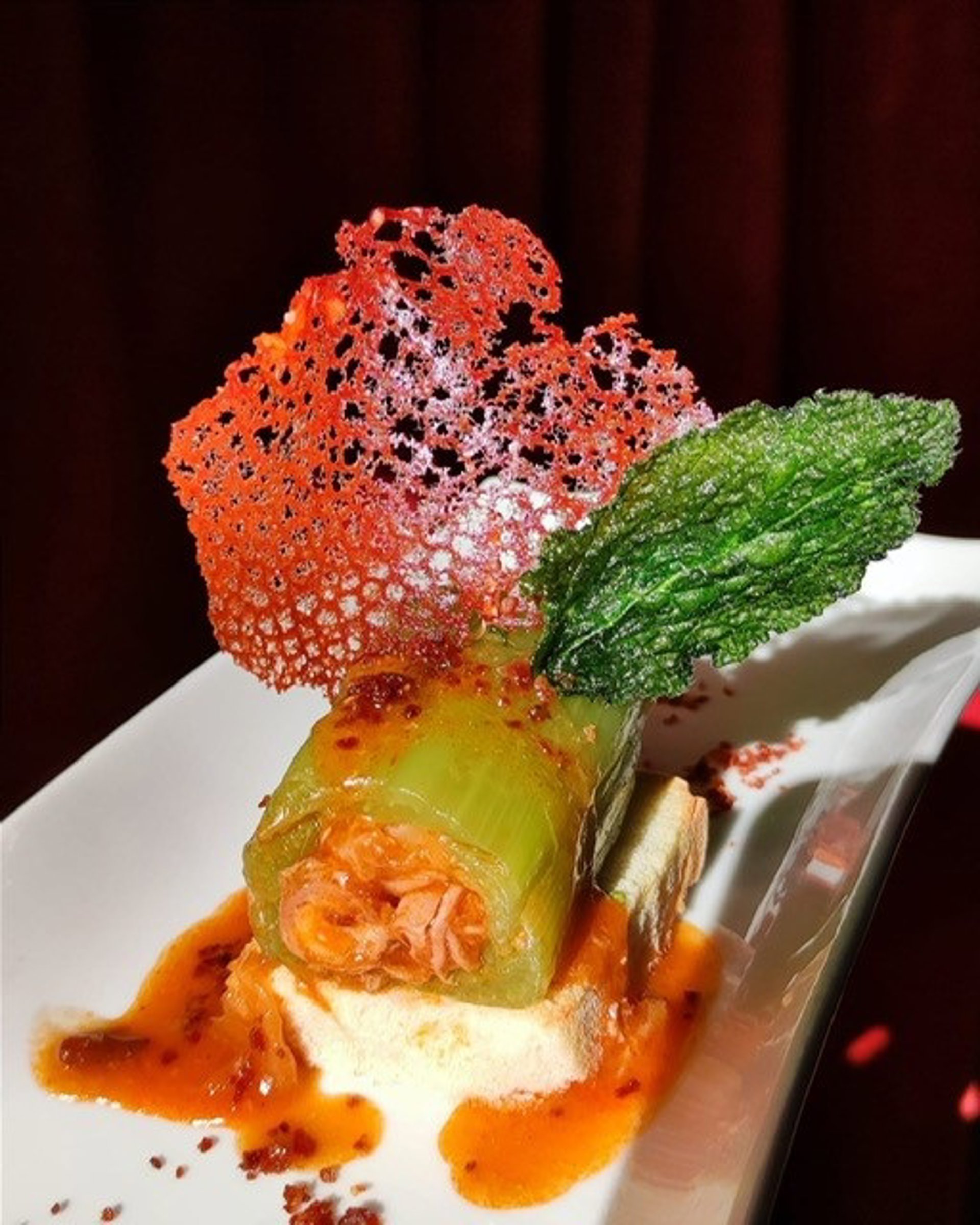 Con el objetivo de realzar nuestros platos tradicionales y producto de la zona, este pincho, tiene forma de canelón y está elaborado con una de nuestras mejores verduras de la ribera del Ebro, la borraja.