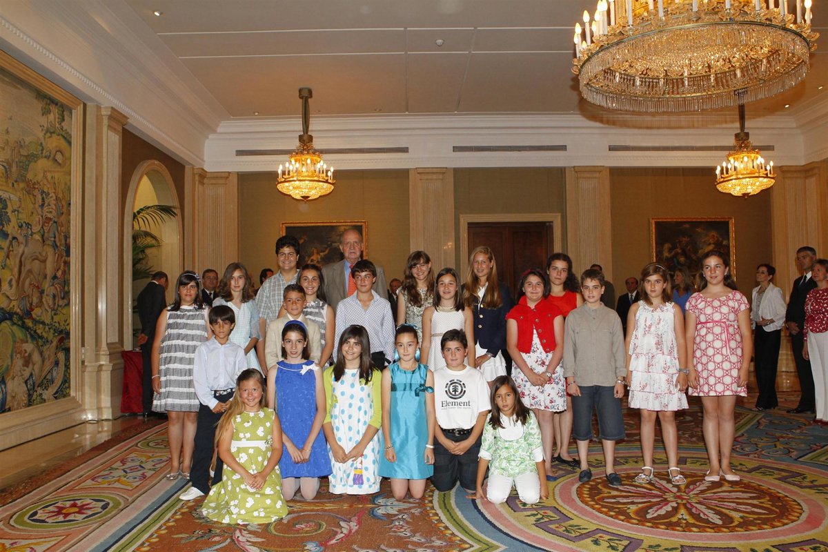 El rey Don Juan Carlos I recibió hoy en el Palacio de La Zarzuela a los niños y niñas ganadores de la XXIX Edición del concurso '¿Qué es un Rey para ti?', organizado por la Fundación Institucional Española y patrocinado por la Fundación Orange.