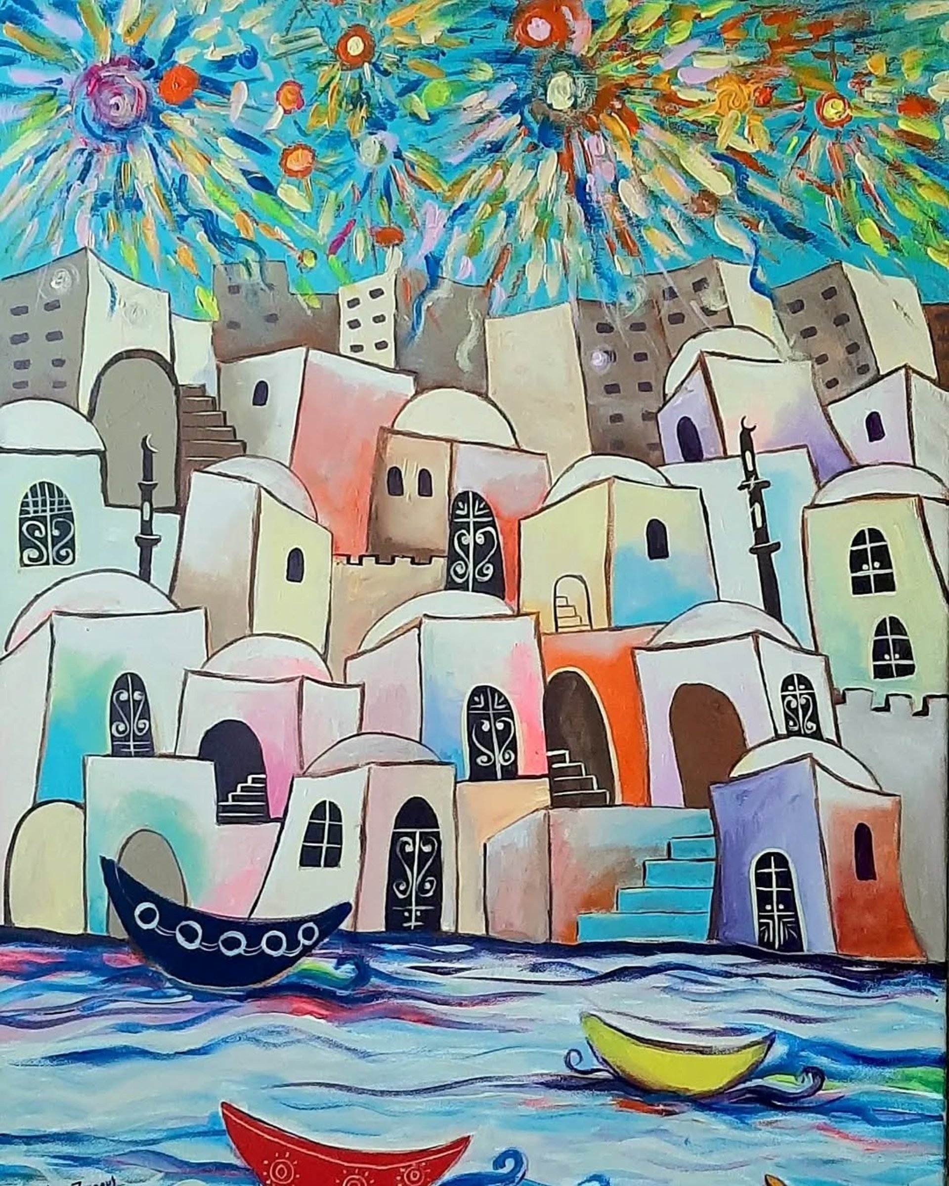 Sus obras hablan de la vieja y nueva vida palestina, del anhelo de paz, del derecho a regresar y de una cultura que perdura a pesar de todas las adversidades. Casas, minaretes, cúpulas e iglesias llenan sus lienzos, símbolos de una existencia y una identidad que no desaparecen.