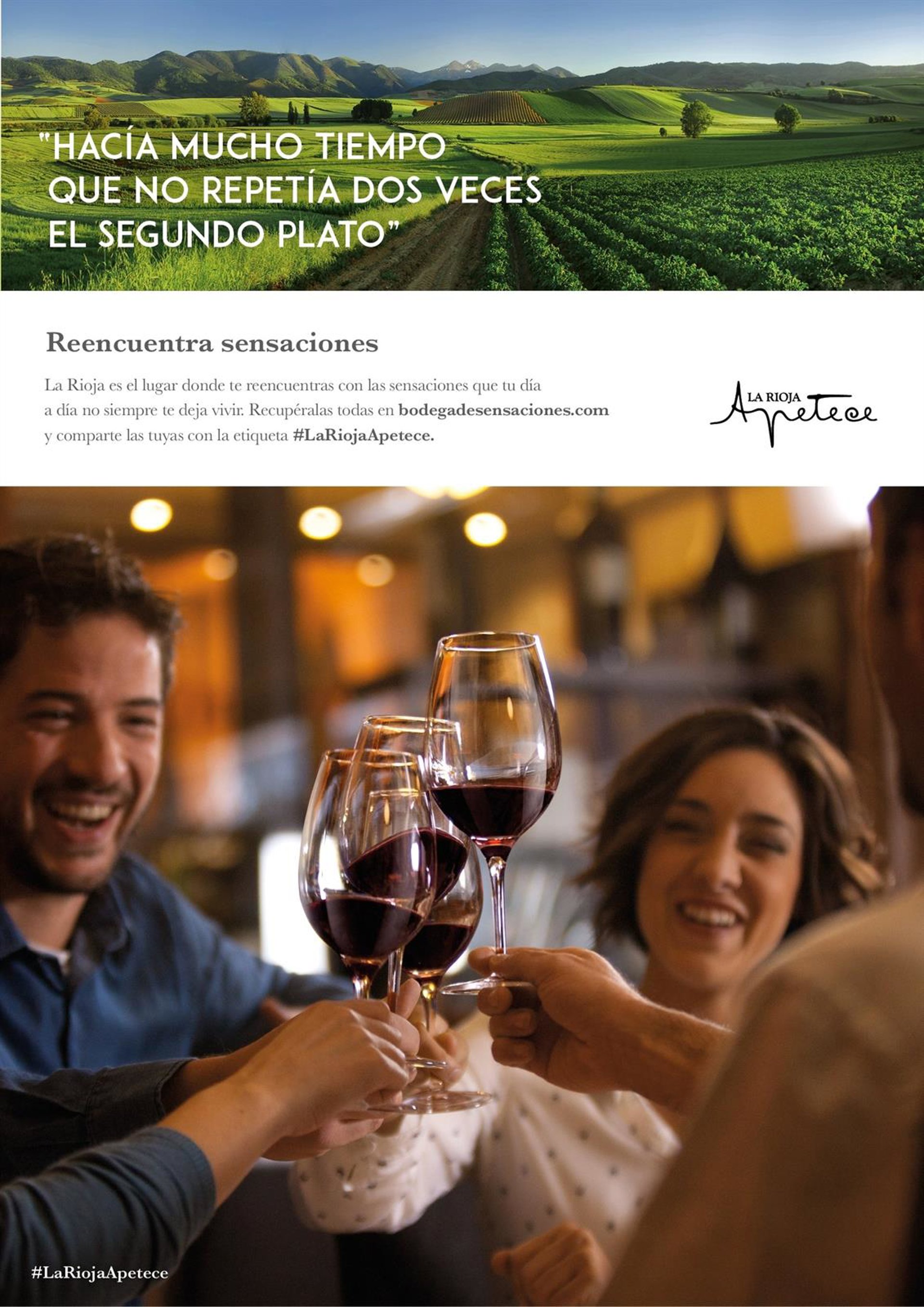 El lema La Rioja Apetece, con el que se promociona la comunidad autónoma, contará, a partir del 13 de abril, con un nuevo apellido: Reencuentra Sensaciones, que invita a visitar La Rioja para volver a sentir "estar un rato en silencio" o "disfrutar de los amigos".