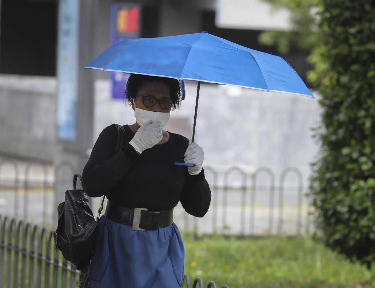 Una mujer protegida con mascarilla y guantes se resguarda de la lluvia bajo su paraguas en la quinta semana del estado de alarma por el coronavirus, Covid-19. En Sevilla (Andalucía, España), a 15 de abril 2020. - María José López - Europa Press