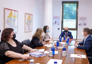 La consejera de Igualdad, Participación y Agenda 2030 del Gobierno de La Rioja, Raquel Romero acompañada por la directora general de Igualdad, Emilia Fernández y el subdirector general de Innovación Educativa, Alberto Abad; se han reunido en Pamplona con el consejero de Educación del Gobierno de Navarra, Carlos Gimeno, la gerente del INAI (Instituto Navarro para la Igualdad), Eva Istúriz y la directora del servicio navarro de Inclusión, Igualdad y Convivencia, María José Cortés con el fin de repasar y analizar conjuntamente el programa navarro de coeducación y educación sexual, SKOLAE.