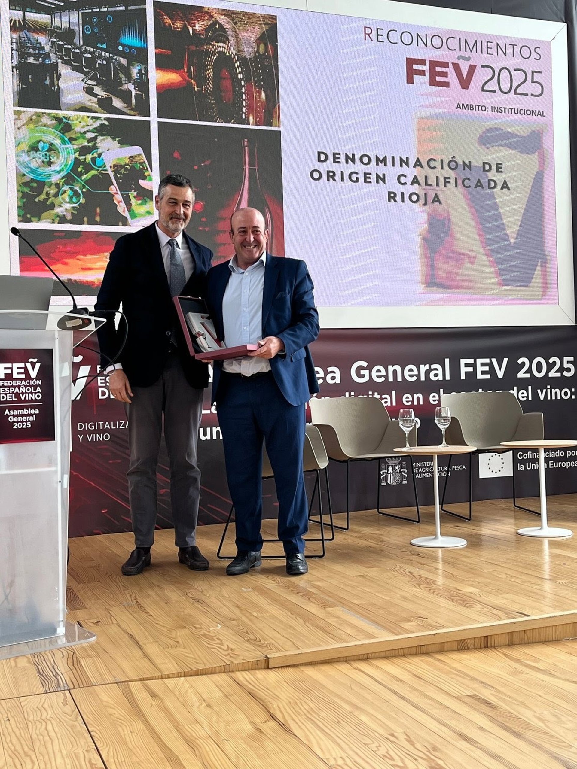 Fernando Ezquerro, presidente del Consejo Regulador de la DOCa Rioja, recogió el premio de la mano de Emilio Restoy, Vicepresidente Segundo de la FEV, al término de la asamblea general del organismo, que ha tenido lugar hoy en el Colegio Oficial de Arquitectos de Madrid (COAM).
