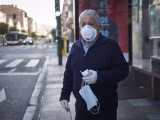 Un hombre protegido con una mascarilla espera al autobús en una marquesina durante el día 32 del estado de alarma y dos días después de que se haya reactivado la actividad laboral no esencial en las empresas cuyos empleados no puedan teletrabajar, en Pa - Eduardo Sanz - Europa Press