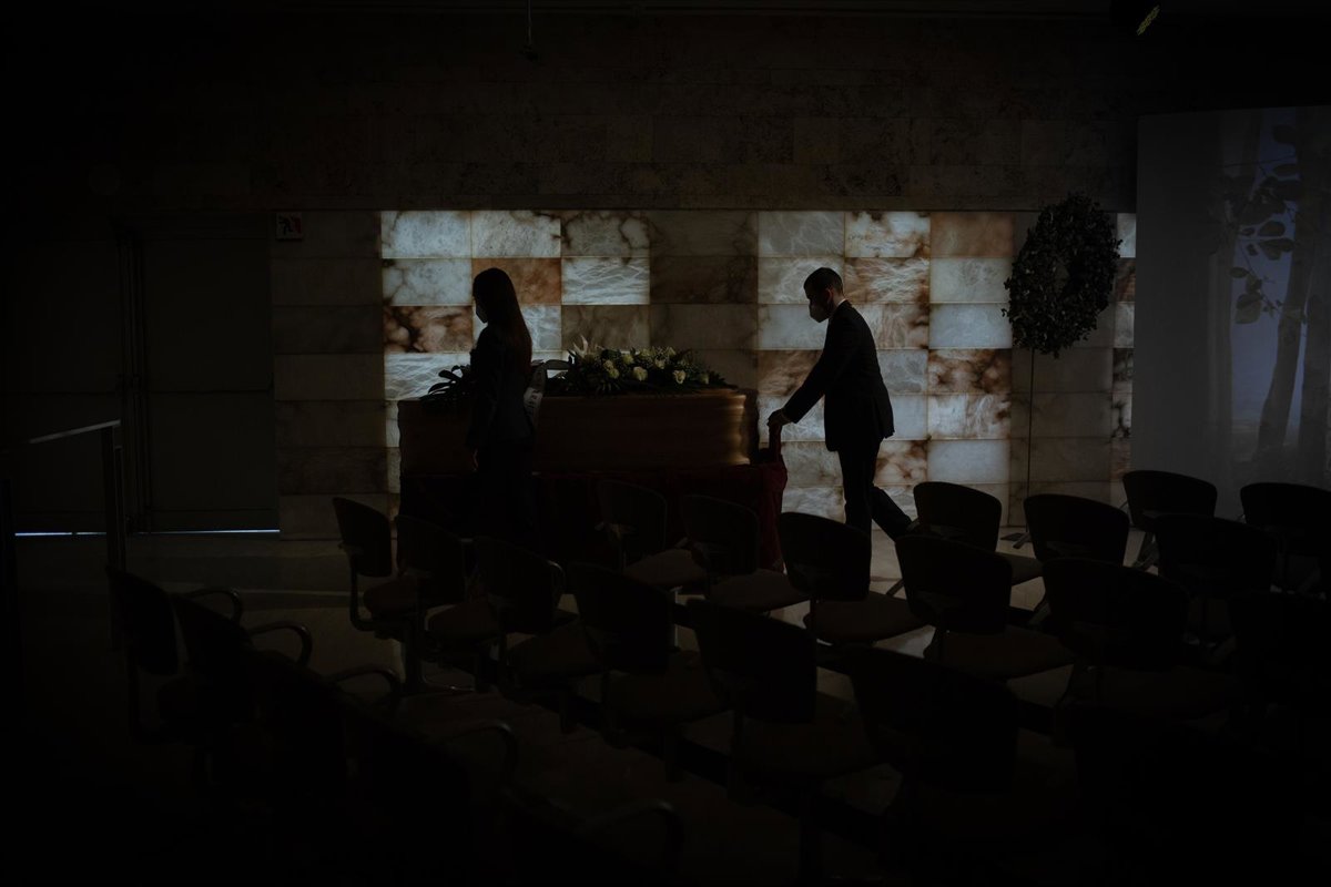 Féretro junto a una pantalla gigante instalada en la sala de ceremonias de Les Corts durante un funeral, en Barcelona - David Zorrakino - Europa Press - Archivo