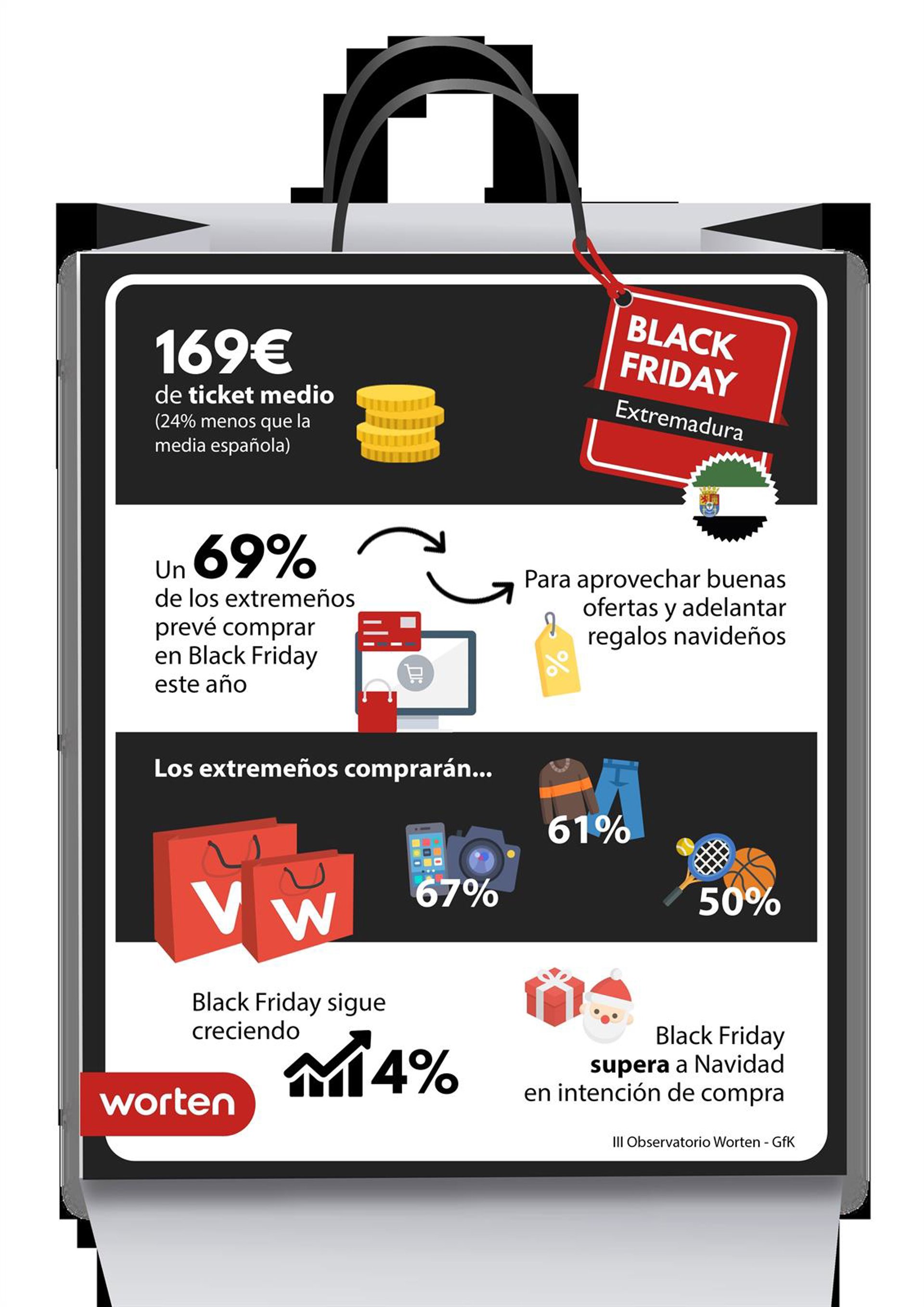 Respecto al ticket medio, La Rioja (297 euros), Aragón (277 euros), Canarias (271 euros) y Andalucía (269 euros) son las comunidades que mayor gasto realizarán por encima de la media. Por el contrario, Cataluña (173 euros), Galicia (170 euros), Extremadura (167 euros) y Castilla y León (155 euros) son las que menos gastarán en el 'Black Friday', muy por debajo de la media nacional.