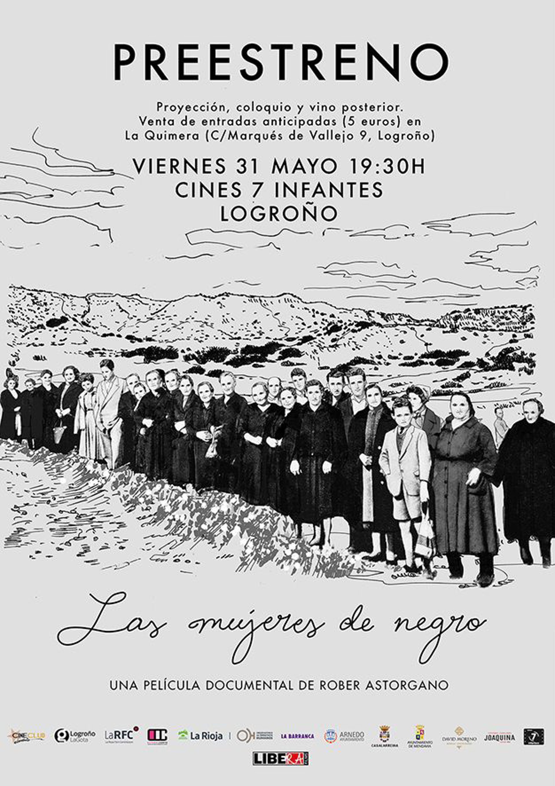 Este viernes 31 de mayo tendrá lugar el preestreno de la película documental 'Las mujeres de negro' del director Rober Astorgano que relata la historia del grupo de mujeres, que siempre de luto, se reunían desde 1936 en el lugar baldío donde yacían los cuerpos de sus familiares asesinados al inicio de la Guerra Civil, preservando su memoria a lo largo de las décadas.