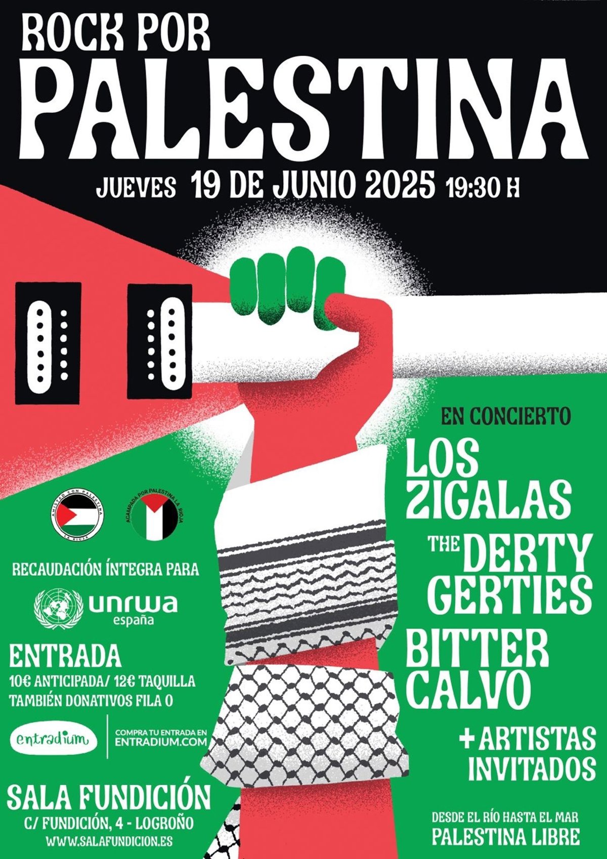 La iniciativa solidaria 'Rock por Palestina' reunirá en un concierto a Los Zigalas, The Derty Gerties, Bittercalvo y otros artistas invitados para recaudar fondos para ayuda humanitaria en Gaza. La cita será el próximo jueves, 19 de junio, a partir de las 19,30 horas en la Sala Fundición.