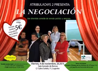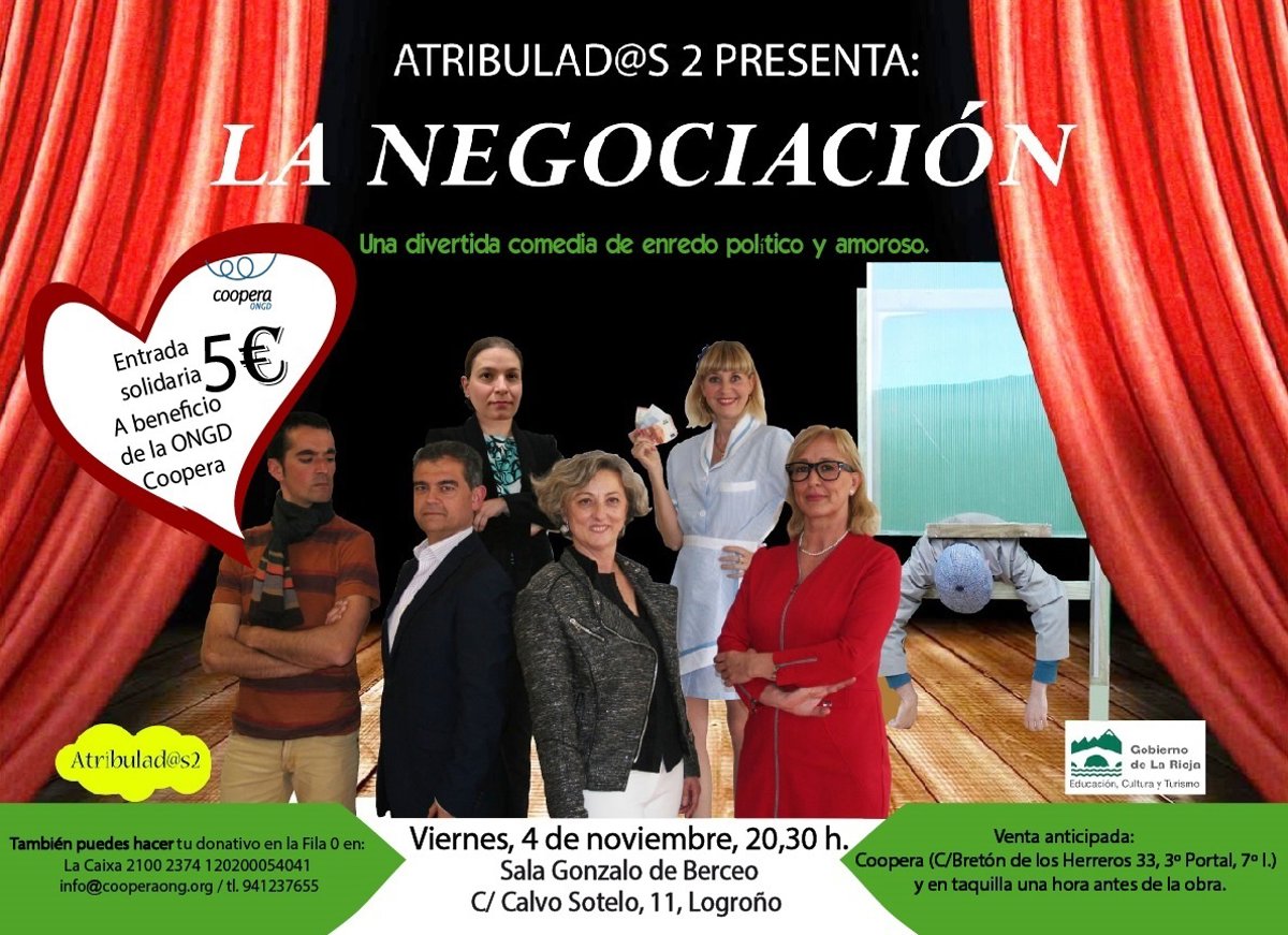 La ONGD Coopera invita a los riojanos a acudir a la representación de la comedia teatral 'La Negociación' que el grupo 'Atribulad@s 2' representará el próximo 4 de noviembre a las 20,30 horas en la Sala Gonzalo de Berceo de Logroño. Se trata de una obra divertida en la que altos cargos de partidos políticos rivales se ven envueltos en una trama de enredo y líos amorosos.