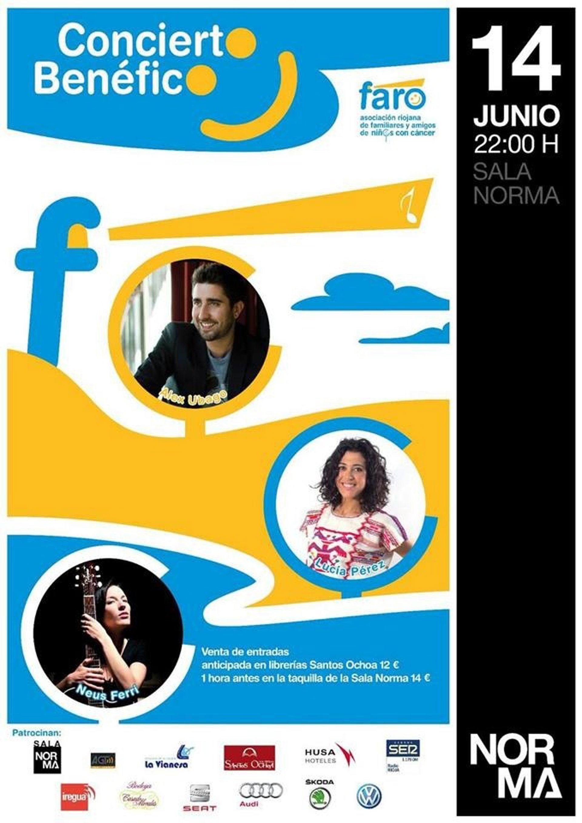 La sala Norma de Logroño acoge el próximo sábado, 14 de junio, un concierto benéfico a beneficio de FARO (Asociación Riojana de Familiares y Amigos de Niños con Cáncer) en el que actuará, entre otros artistas, Alex Ubago. El concierto comenzará a las 22,00 horas.