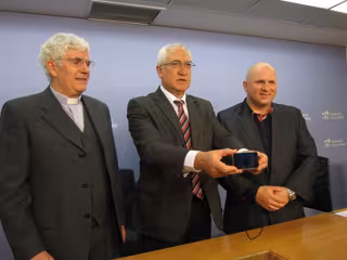 Bayo ha presentado la nueva herramienta, similar a un teléfono móvil, acompañado por el presidente de la Asociación de Personas Sordas de La Rioja, Luis Mariano Rodríguez, y el fraile del monasterio de Yuso, Jesús Lerena.