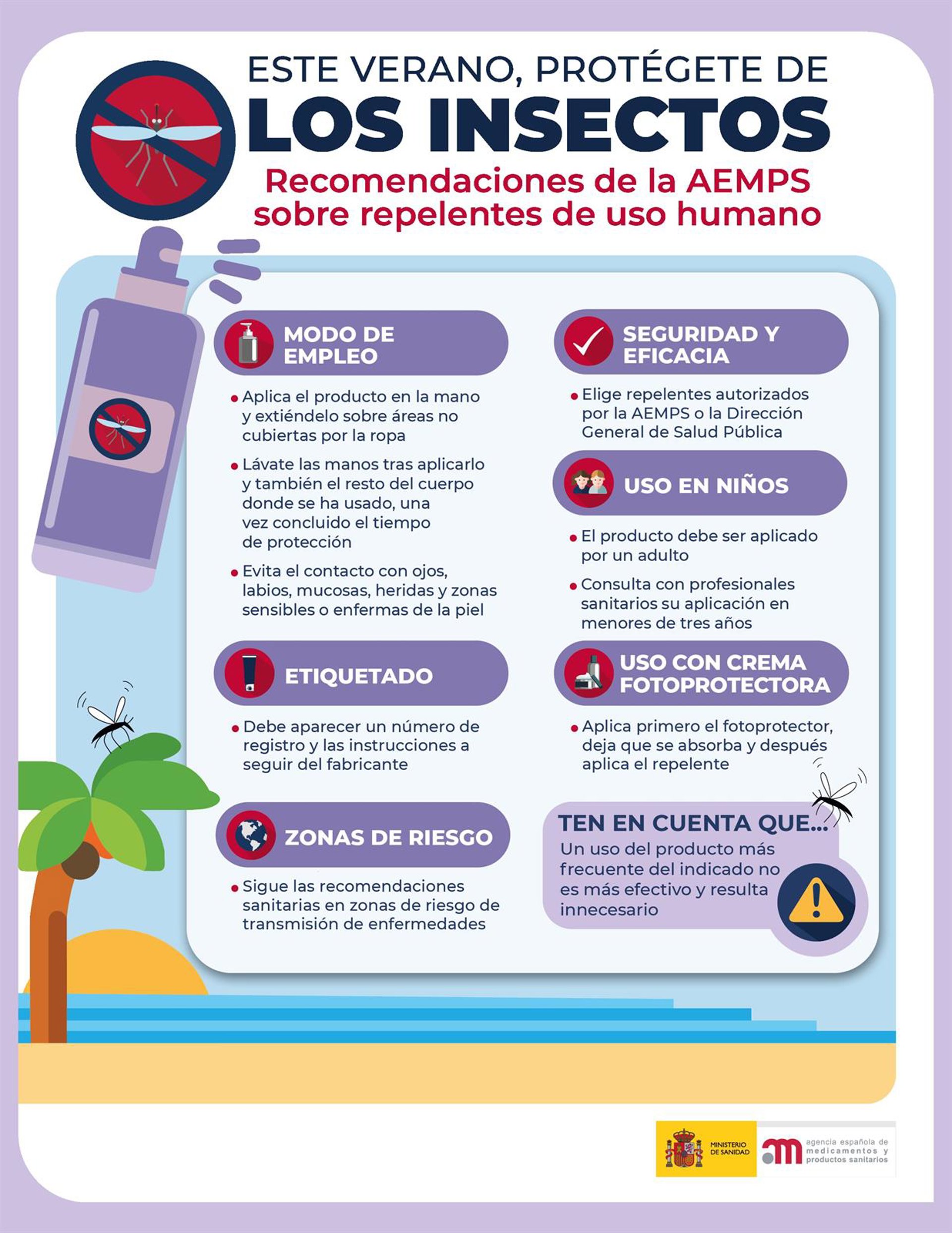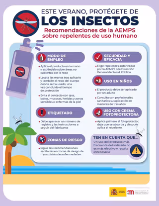 La Agencia Española de Medicamentos y Productos Sanitarios (AEMPS) ha publicado sus recomendaciones para una correcta identificación y buen uso de los productos repelentes de uso humano.