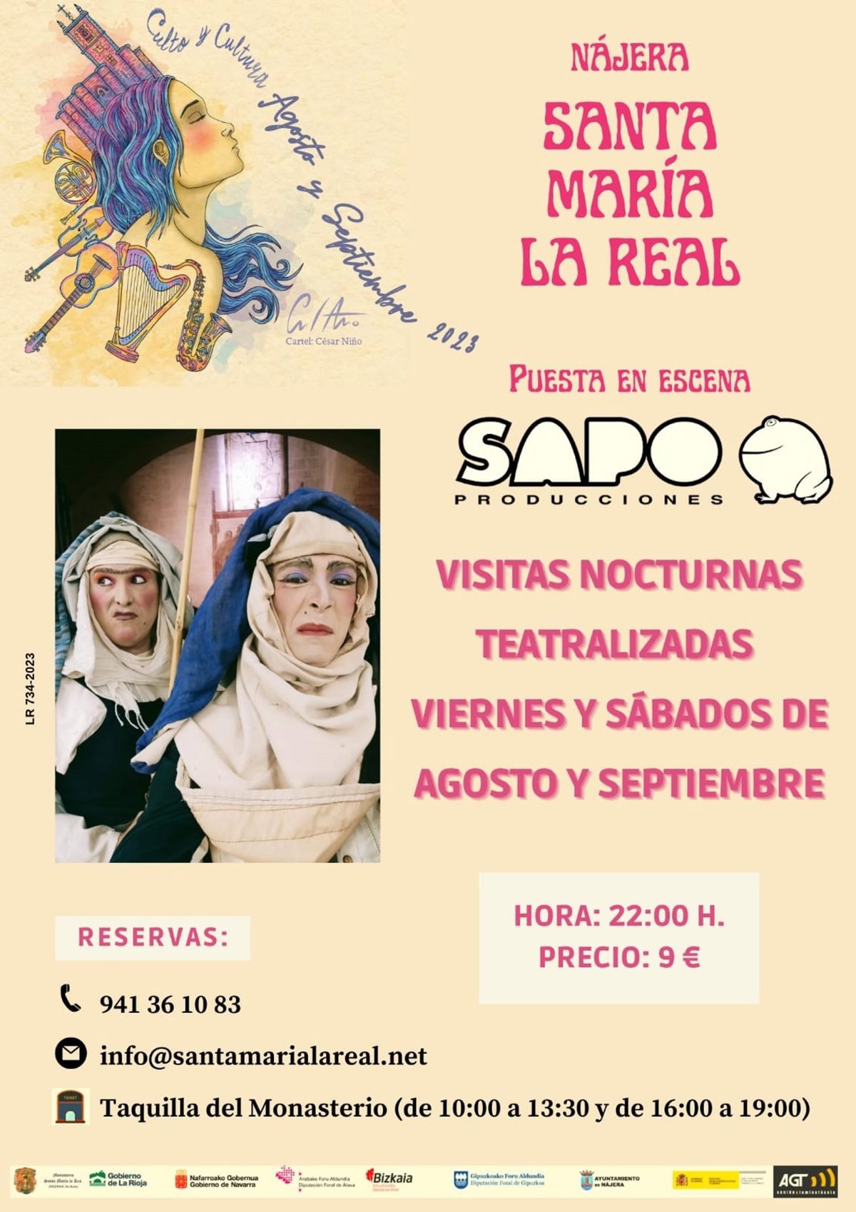 El Monasterio de Santa María la Real de Nájera ofrecerá visitas nocturnas teatralizadas durante los fines de semana de los meses de agosto y septiembre. Éstas comenzarán a las 22 horas cada viernes y sábado, a partir del próximo 4 de agosto, y permitirán a los asistentes visitar el monasterio y disfrutar de escenas, personajes y acontecimientos representativos de la historia del monasterio y de Nájera.