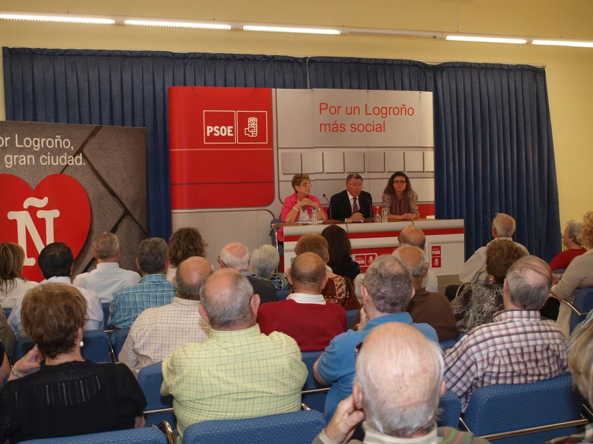 El candidato socialista a la alcaldía de Logroño, Tomás Santos, acompañado por Pilar Criado e Inmaculada Sáenz, se ha reunido durante la mañana de este jueves, 19 de mayo, con personas de la tercera edad para dar a conocer las propuestas del PSOE para los mayores.