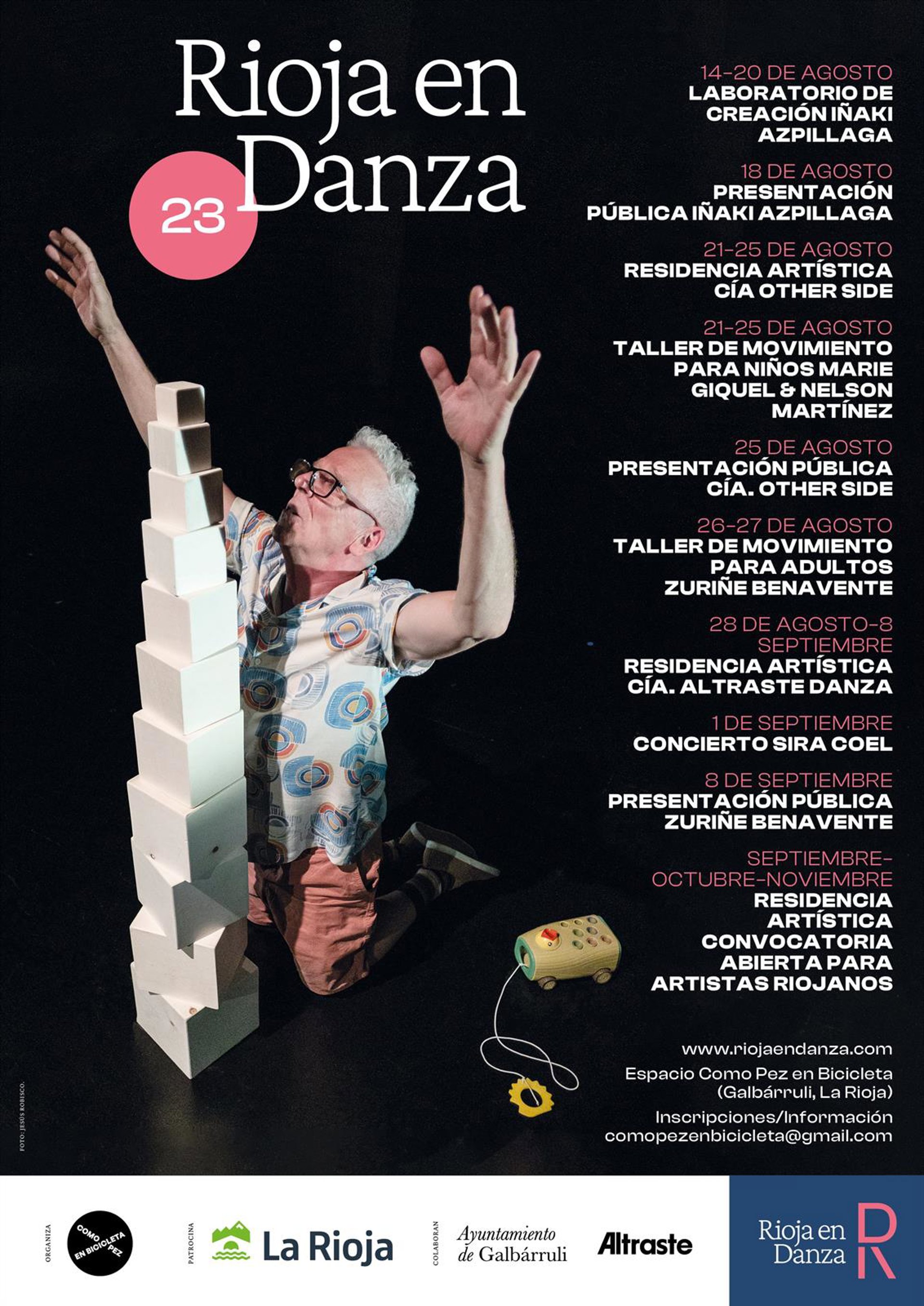 Colombia, Francia, Bélgica, Alemania y España son los países representados en esta segunda edición del 'Festival Rioja' en Danza que se desarrollará en el Espacio de Creación e Intercambio cultural Como pez en bicicleta de Galbárruli y que contará con actuaciones, conciertos, talleres y dos residencias artísticas, actividades todas ellas enmarcadas dentro de los mundos de la danza y la música contemporánea.