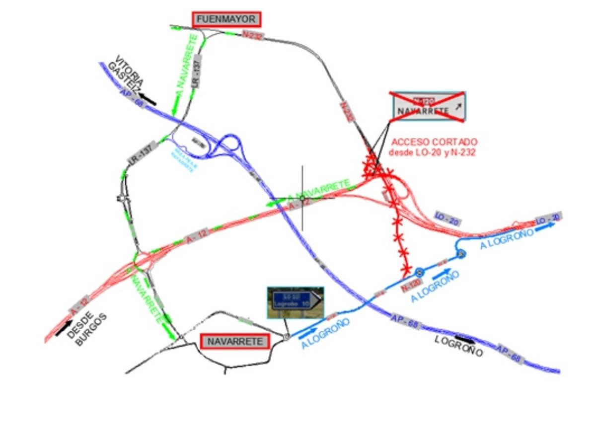 Por necesidades de obra, se hizo necesario cortar al tráfico el tramo de la carretera N-120 de conexión con la carretera de circunvalación LO-20 y la carretera N-232, hacia y desde Navarrete.