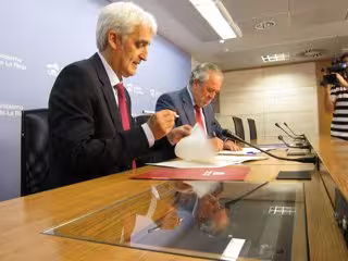 El consejero de Salud y Servicios Sociales, José Ignacio Nieto, y el rector de la Universidad de La Rioja, José Arnáez Vadillo, han firmado esta mañana un convenio de colaboración para la financiación del programa de la Universidad de la Experiencia, que incentiva la participación de los mayores de 60 años en la oferta académica de la Universidad de la Rioja.