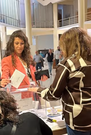 Soriano ha acudido a las 12:30 horas a su colegio electoral acompañada de parte de su equipo, entre ellos, el candidato a la Alcaldía de Logroño, y secretario general del partido, Alberto Bretón.