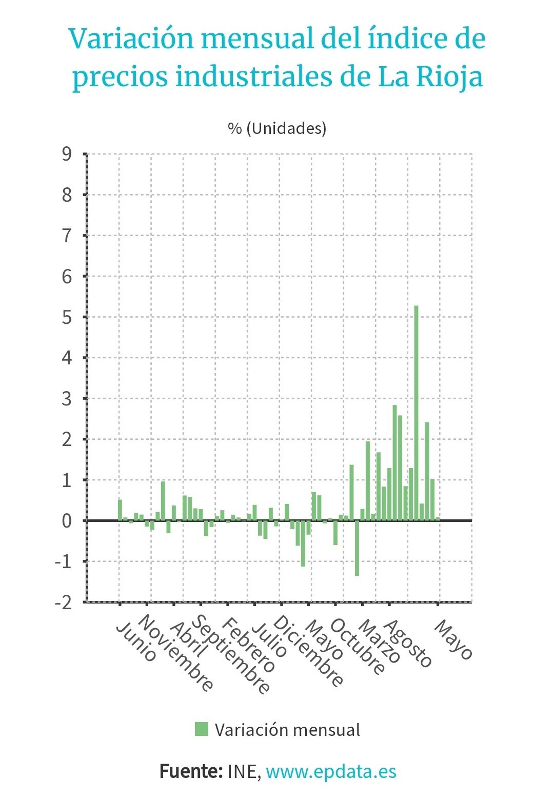Los precios industriales en La Rioja subieron un 0,1 por ciento el pasado mes de mayo en relación al mes anterior, ocho décimas menos que en España, y repuntaron un 22,5 por ciento en tasa interanual, 21,1 puntos menos que en el resto del país donde se dispararon un 43,6 por ciento, según ha informado este lunes el Instituto Nacional de Estadística (INE).