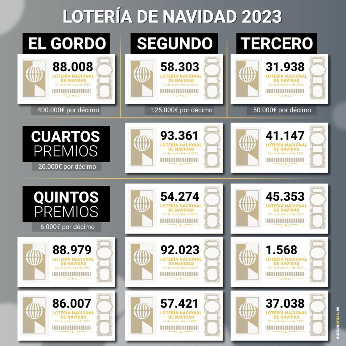 Grandes premios del Sorteo Extraordinario de la Lotería de Navidad 2023. - Europa Press
