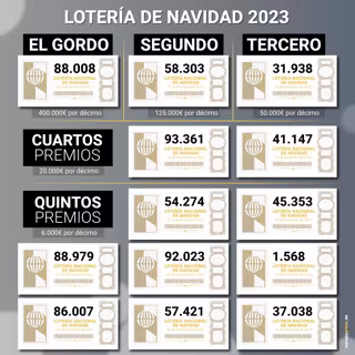 En todo caso, se mantiene la cuantía de los premios: el 'Gordo' de Navidad o primer premio, son 4.000.000 de euros a la serie (400.000 euros al décimo); el segundo premio, de 1.250.000 euros a la serie (125.000 euros al décimo); o el tercero, de 500.000 euros a la serie (50.000 euros al décimo).