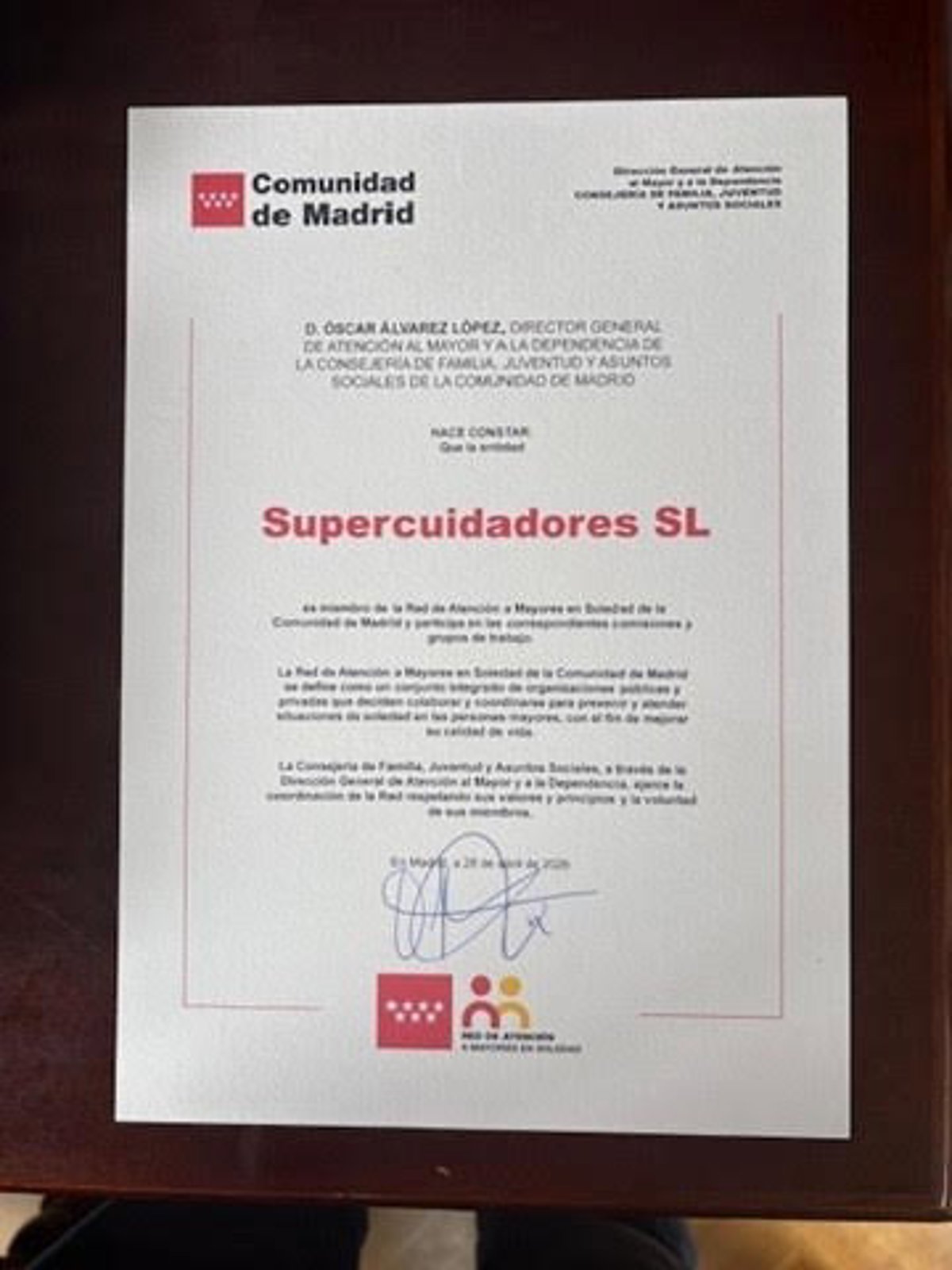 SUPERCUIDADORES S.L. se ha incorporado oficialmente a la Red de Atención a Mayores en Soledad de la Comunidad de Madrid, una iniciativa coordinada por la Dirección General de Atención al Mayor y a la Dependencia, dependiente de la Consejería de Familia, Juventud y Asuntos Sociales.