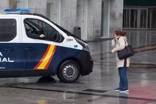 Un agente de la Policía Nacional dentro de un coche habla con una mujer que camina por la céntrica calle de Preciados - Joaquin Corchero / Europa Press - Archivo