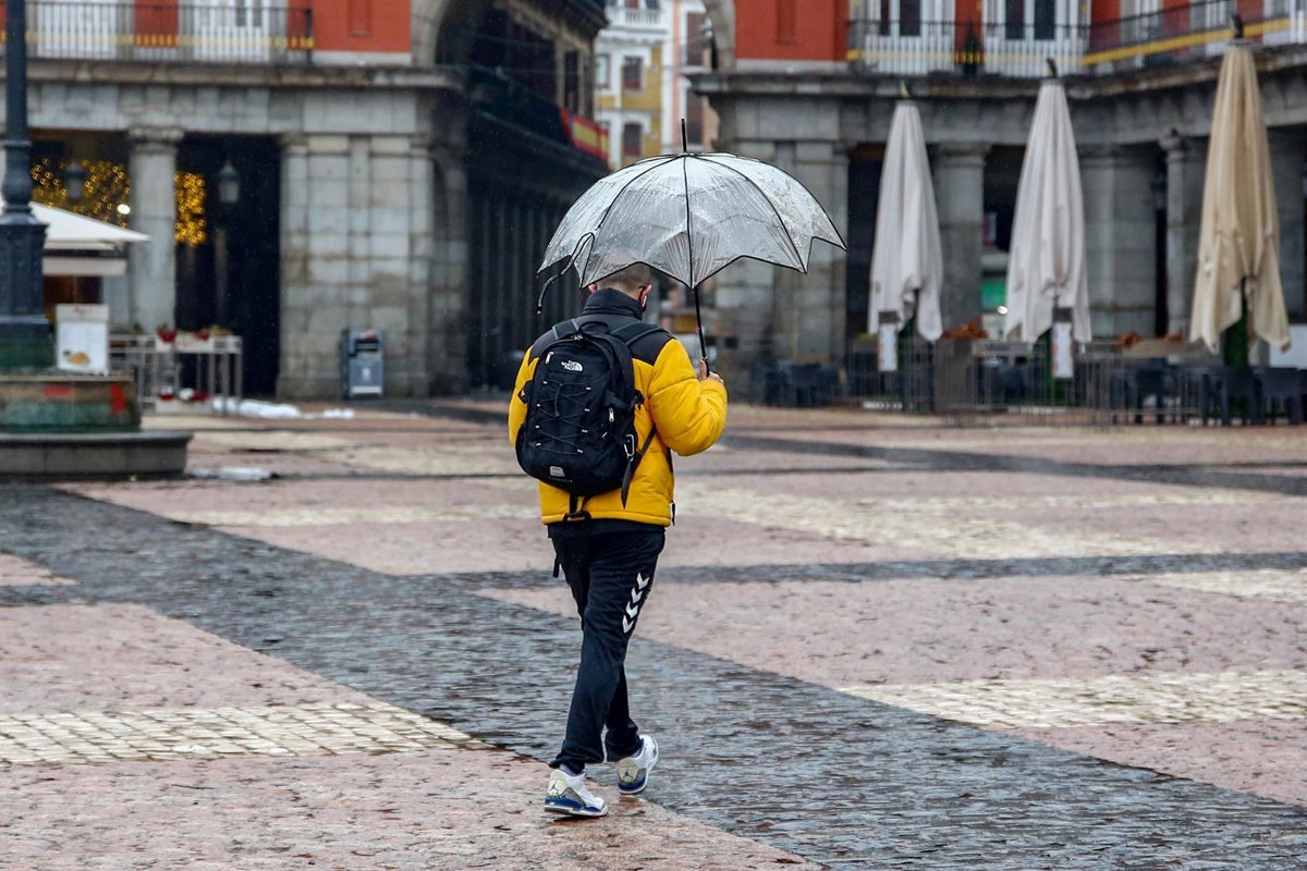 Un hombre camina protegido por un paraguas el mismo día de la llegada del temporal Gaetán, en la Plaza Mayor de Madrid, (España), a 20 de enero de 2021. - Ricardo Rubio - Europa Press